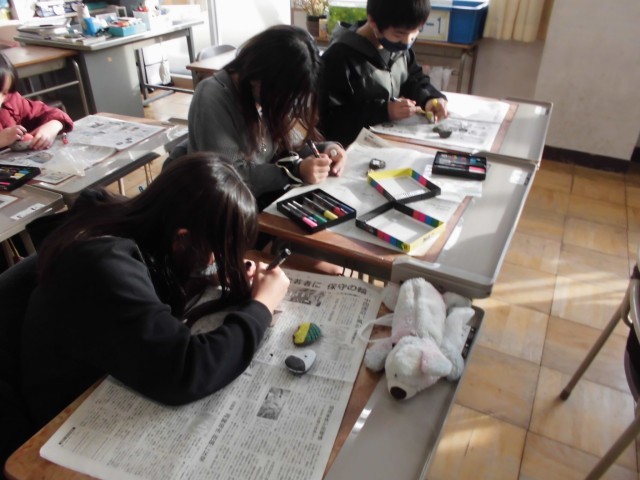 6時間目は4・5・6年生が共に活動する、待ちに待ったクラブの時間でした。 校舎内の創作クラブを覗くと、持参した石に色を塗る「石ころアート」の真っ最中。石の形を何かに見立てた、想像力豊かな作品が次々と誕生していました。一方、ボードゲームクラブでは先生も輪に加わり、学年を越えて真剣勝負! 異学年が交流しながら、自分たちの「好き」を追求する。そんな子どもたちの生き生きとした姿が印象的なひとときでした。