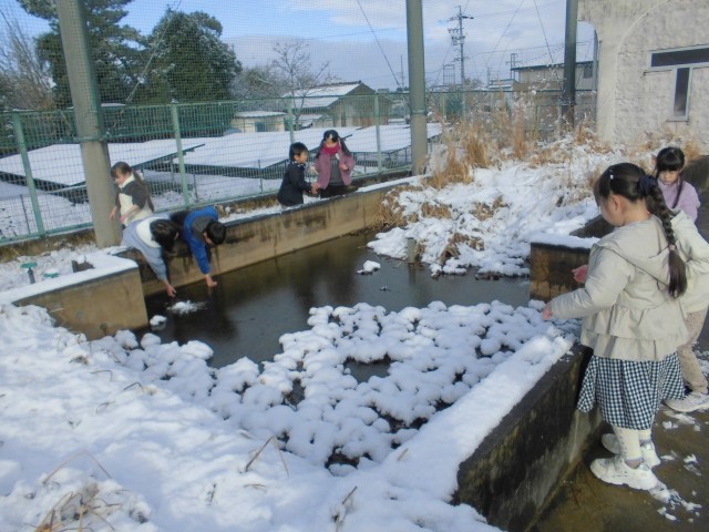 また、観察池には氷が張っており、指で触って「冷たい!」「割れたよ!」と驚きの声を上げる場面も。寒さに負けず、冬ならではの自然の不思議に触れた、素敵な体験学習となりました。