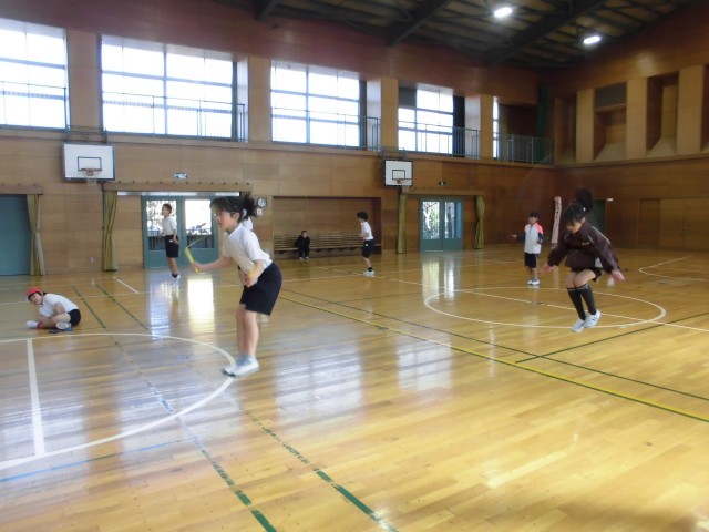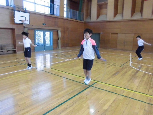 雪もちらつく寒い日ですが、5年生はみんな元気に体育でリズムなわとびの練習をしました。