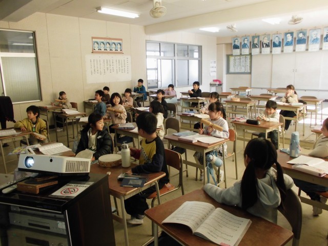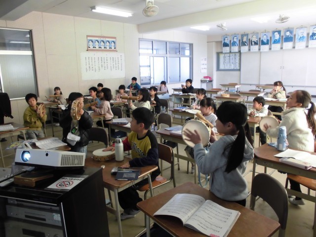音楽室から楽しそうな音色が聞こえてきました。「こぶたぬきつねこ」の曲に合わせて楽器演奏に挑戦しています。