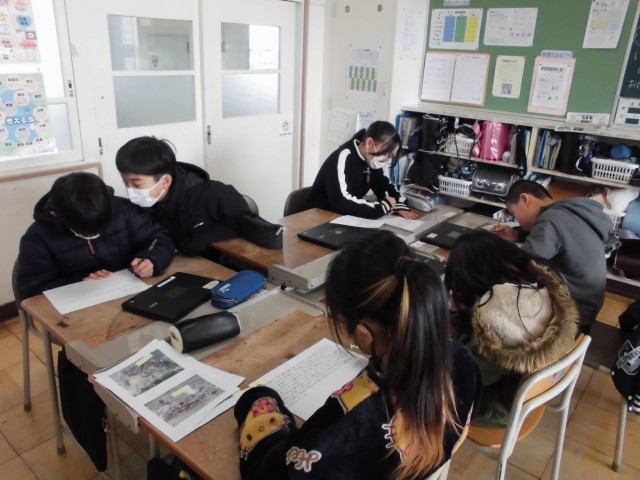 今日は、完成した作品の鑑賞会です。友達の文章を読み合い、比喩や語彙の選び方に注目しながら、素敵な表現をたくさん見つけていました。互いの感性に触れ、言葉の力を実感する温かな時間となりました。
