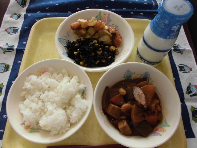 牛乳・ご飯・ボラのみかんソースがらめ・ひじきの炒め煮・煮みそ