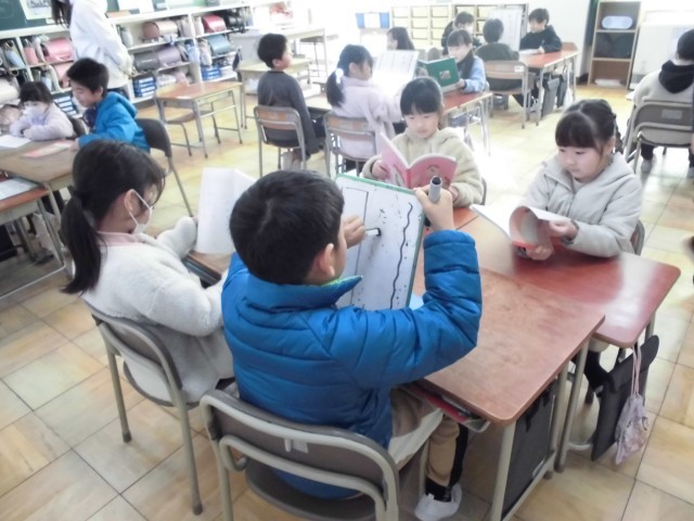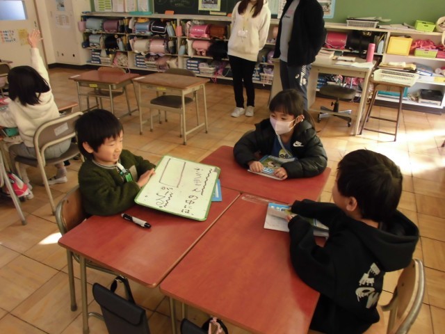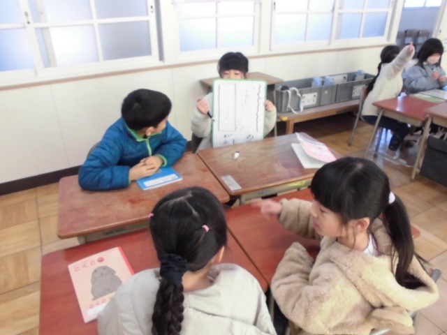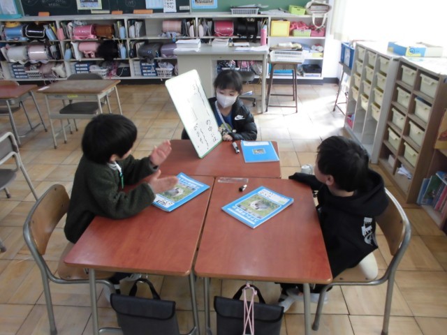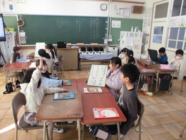 「ことばあそびをつくろう」の学習で、子供たちが自作のクイズ大会を開きました 。 「かばんの中にはかばがいる」といった教科書の例文を参考に、自分たちで言葉遊びのクイズ作りに挑戦しました 。 「おにぎりの中には□□がいる」といった具合に、言葉の中に別の言葉を見つけてクイズを出し合い、盛り上がりました 。 生き物なら「いる」、物なら「ある」と、文末の表現まで正しく使い分けることができており 、遊びを通して言葉の豊かさに触れる素晴らしい学びの場となりました。