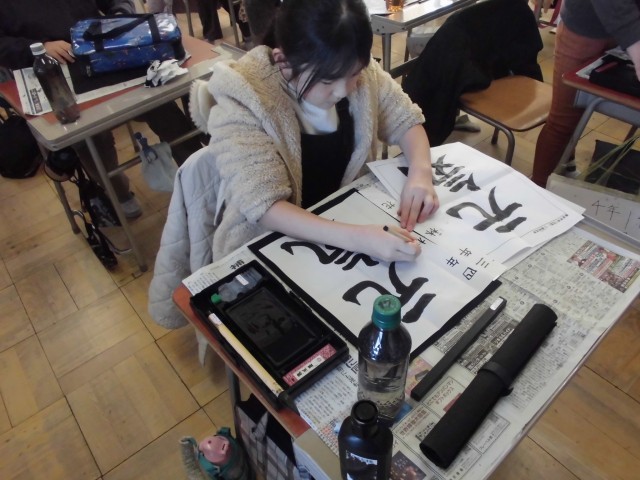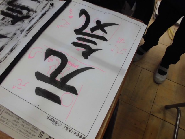 特に「曲がり」や「はね」の向きは難しいポイントですが、先生のアドバイスをお手本にびっしりメモする熱心な姿も。一人一人が集中して半紙に向き合っていました。書き上げた後の、満足そうな表情が印象的です。