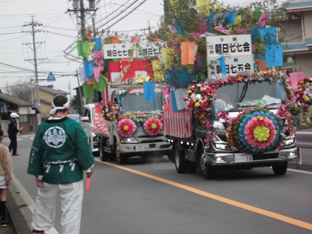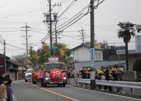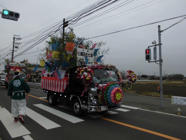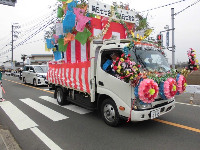 本日、国府宮はだか祭りに向けた朝日地区の鏡餅奉納パレードが行われました。にぎやかなお囃子の音色とともに、大きな鏡餅を乗せたトラックが学校前に到着。