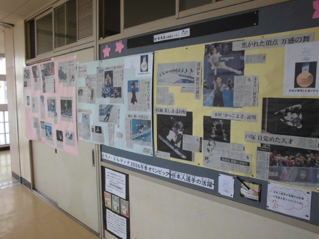 本校のNIEコーナーに、ミラノ・コルティナ冬季五輪で活躍した日本人選手の記事を掲示しました。子供たちに紹介すると、早速、児童が集まり、コメントを書き込んでいます。