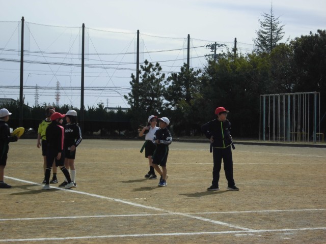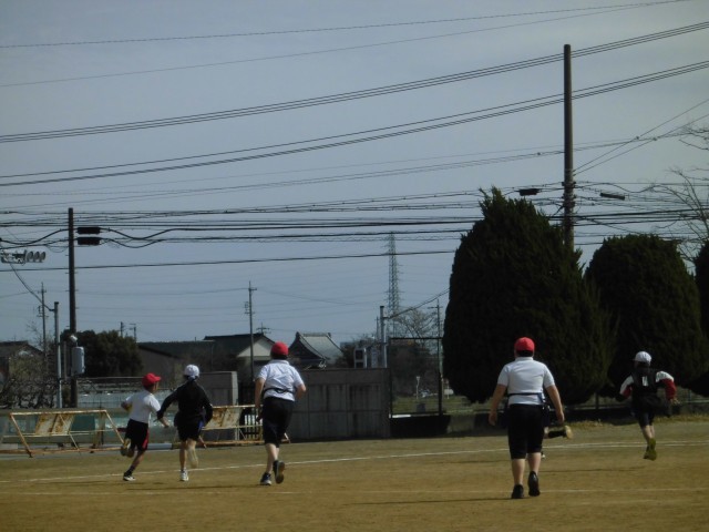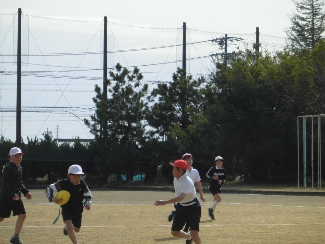 体育で「タグラグビー」に挑戦しています。ラグビーに似ていますが、タックルの代わりに腰のタグを取る安全な競技です。