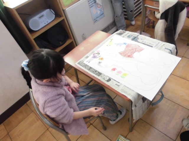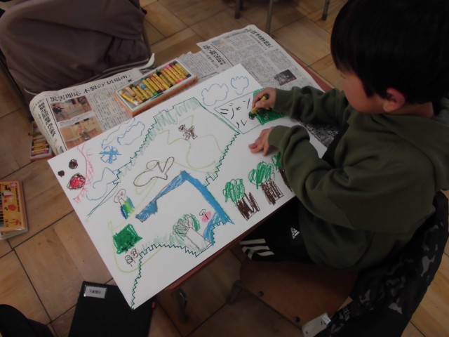 「さらさら」「ぎざぎざ」といった音の響きから、自由に線を広げていく子供たち。その線からさらに「ここは森かな?」「お魚が泳いでる!」とイメージを膨らませ、お気に入りの色や形をどんどん描き足していました。夢中でクレヨンを動かし、自分だけの物語を完成させていく姿は、まさに小さな冒険家。教室中が、楽しそうな笑顔と色彩でいっぱいになりました。