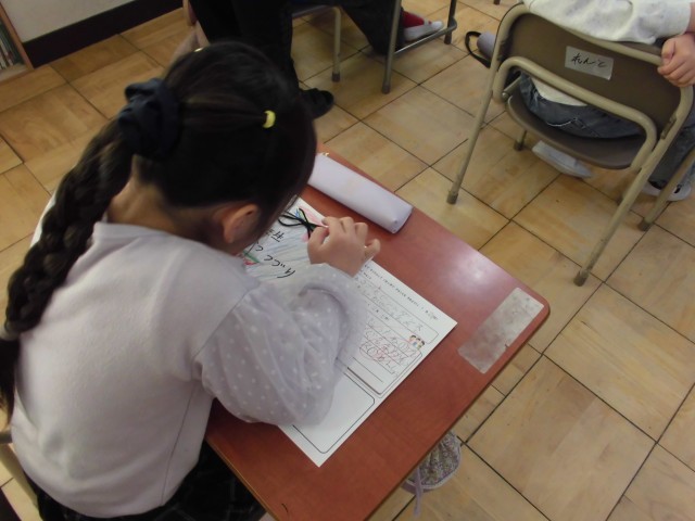 今回は穴を開けた紙に紐を通し、「リボン結び」に挑戦!初めての経験に苦戦する子が多い中、スッと結べる子が「こうやるんだよ」と優しく教える温かな光景も見られました。