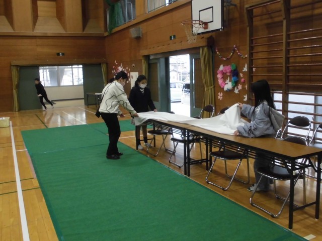 6年生が歩くカーペットを丁寧に掃除し、通路を色とりどりの花々で彩ります。また、保護者の皆様を気持ちよくお迎えできるよう、玄関の靴箱もピカピカに磨き上げました。