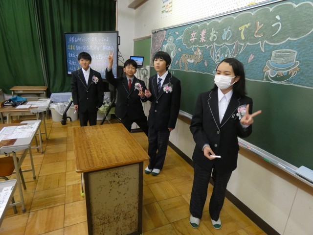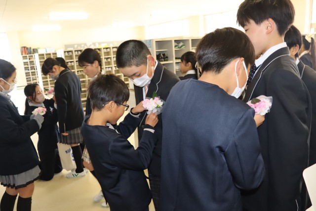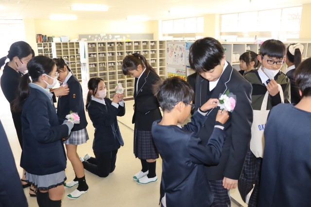 いよいよ旅立ちの朝。少し照れくさそうに胸を張る6年生の姿に、胸が熱くなります。5年生が丁寧にコサージュを添えると、その表情はぐっと引き締まり、頼もしい「最高学年」の顔に変わりました。凛とした足取りで教室へ向かう背中に、大きなエールを送ります。