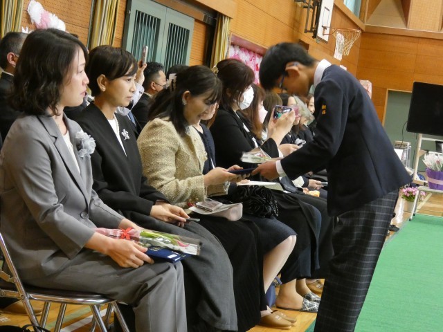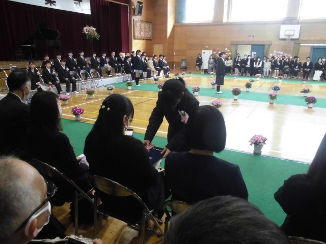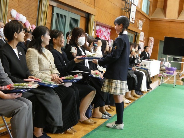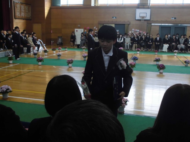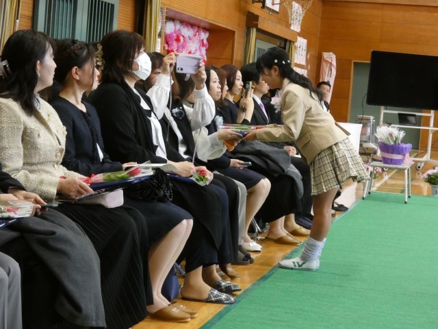 証書を手にした卒業生は、そのまま保護者席へと向かった場面です。子どもたちは、色鮮やかなお花を添えて「今までありがとう」と真っ直ぐな言葉を伝えながら、お父さんやお母さんに証書を手渡しました。