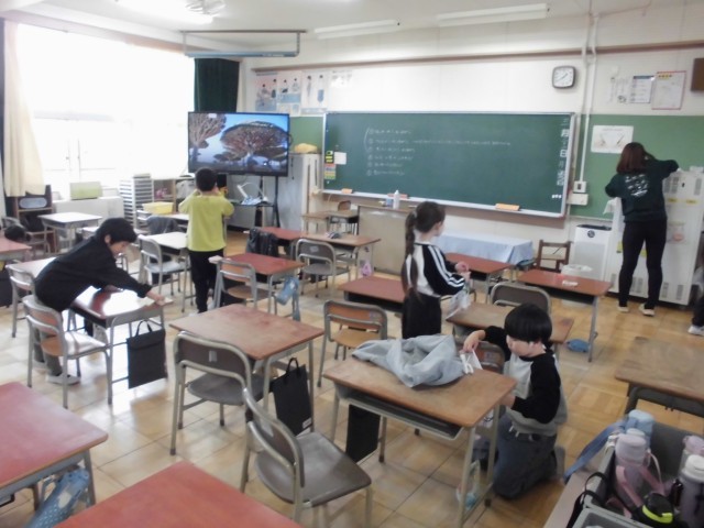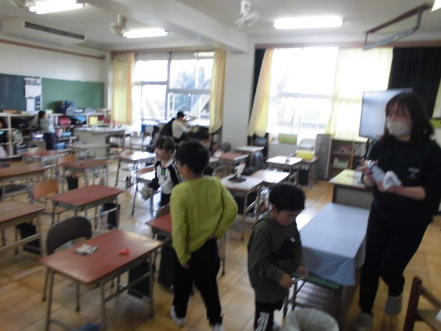今日、1年生の教室では大掃除が行われました。4月に入学してくる新しい1年生に教室を譲るため、机の中を整理し、1年間お世話になった床や壁を一生懸命に磨いていました。一年間お世話になった教室を自分たちで掃除をする姿から、この一年の成長を感じました。感謝の気持ちを込めて片付けを終えた子供たちの表情は、すっかりお兄さん、お姉さんの顔つきです。心も体も、立派に2年生への準備が整ったようです。