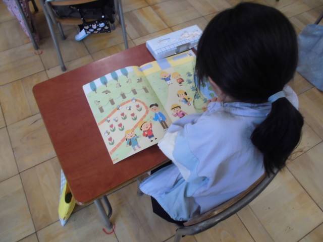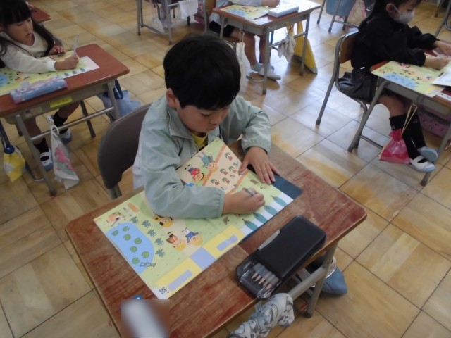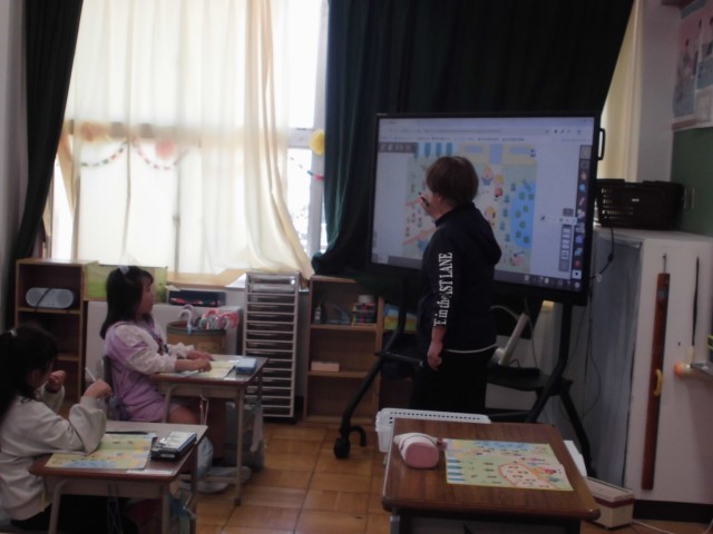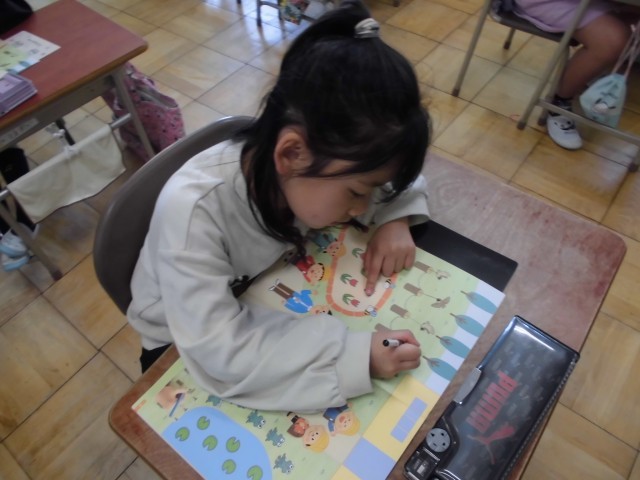 算数の大切な一歩、「一対一対応」の学習が始まりました。鳥と枝を線で結んだり、カエルとはっぱを繋いだり。「あ、はっぱが一つあまった!」と、手を動かしながら数の違いを発見しています。