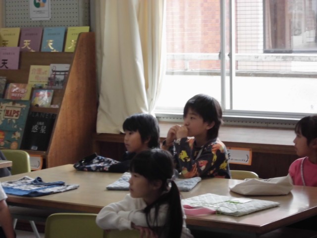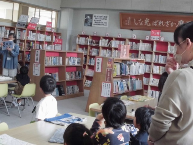 2年1組の友だちと一緒に図書館の説明を聞きました。自分の好きな本がどこに並んでいるかがわかりました。