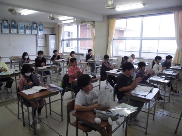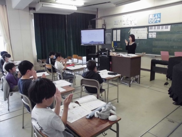 「フォルテ(強く)」と「ピアノ(弱く)」、その違いをリズム打ちで表現できるように工夫しています。音楽ワークに3種類のたたき方の紹介がありました。実際にやってみると「手の形を変える」聞こえ方が違うことを発見!