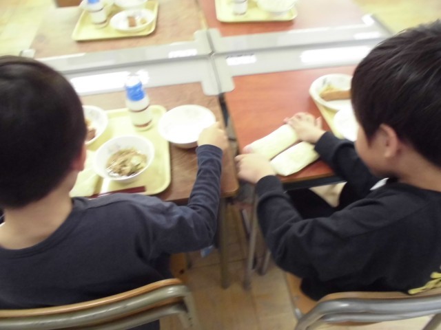 今日は子供たちが楽しみにしていた今年度初のラーメンでした。どの学年もつけ分けてから残った麺や汁の争奪戦が行われていました。1年生にとっては人生初の学校ラーメン!袋の麺を小分けして、少しずつ汁に入れるなど、苦戦しながらも一生懸命な姿が微笑ましかったです。実はこの麺、成長に合わせて3つのサイズがあります。写真の通り、低学年と高学年では厚みが全然違います。成長に必要な栄養が詰まった給食、好き嫌いせずモリモリ食べて、元気に大きくなってほしいですね。