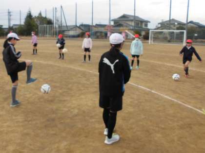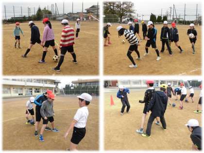 体育でサッカーに取り組んでいます。最初はボールを足で扱う感覚を養うために、ボールタッチやペアでトラップ、パスの練習をしました。そのあとには、グループに分かれ、股下通しリレーをしました。チームメイトの足と足の間を通して一番後ろの子まで届くように、まっすぐパスすることを意識して、一生懸命に取り組んでいました。