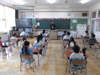 算数では、「なんばんめ」の学習に入りました。子どもたちは、動物が一列で歩いている絵を見て、「うさぎは前から2番目」「たぬきは後ろから3番目」などと正しく言うことができました。また、アイスクリームの絵を見て、「ぶどうアイスは上から2番目」「りんごアイスは右から3番目」など、上下、左右に並んだものの位置も正しく表すことができました。どの子も元気よく手を挙げて発表しました。