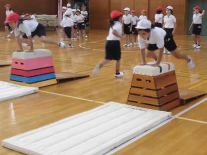 4段を基本にして、できる子は6段に挑戦しました。何回も跳んでいるうちに、膝が伸びたきれいなフォームで多くの子が跳べるようになりました。