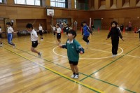 子どもたちは週3回の体育の授業を楽しみにしています。今日は、マットあそびをしました。ふわふわマットで横転がりをしてから、傾斜を入れたマット・ふつうにひいたマット・ふわふわマットを組み合わせて、前転がりをしました。学習チューターである大学生にも手伝ってもらって転がる運動をがんばりました。