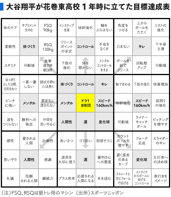 👉大谷翔平選手が、花巻東高校1年生の時に考えた目標達成表