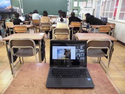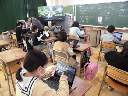ゲームや動く物語などなど、面白い作品がいっぱいです。クロームブックの画面で共有して、作品を見せ合って発表しています。