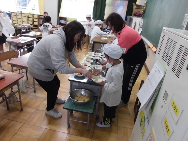 給食の準備が始まりました。どの学年も当番が手際よく盛り付けを進めています。低学年...