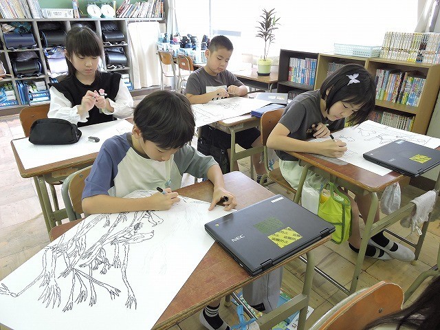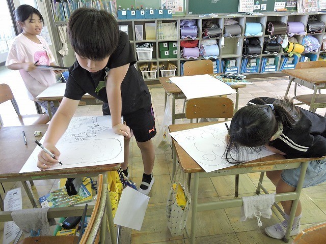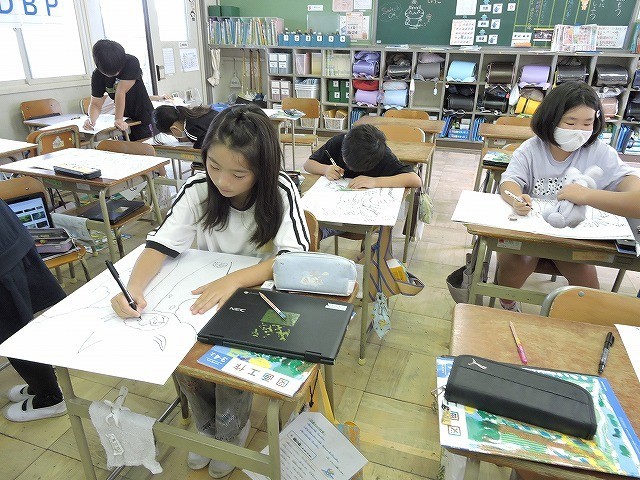 物語の絵を描いています。今は下絵を鉛筆やペンで仕上げています。1人1人がよい作品にしようと真剣に取り組んでいました。