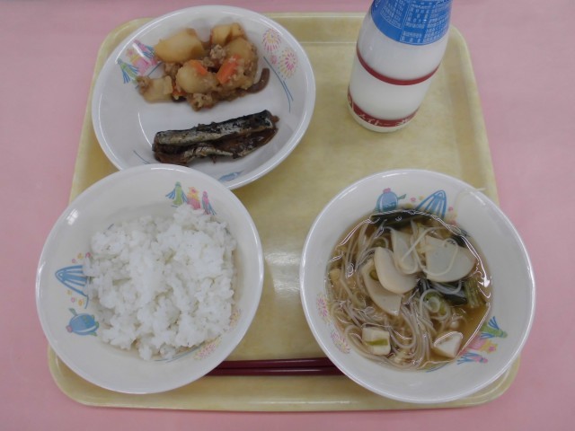ごはん・牛乳・いわしの梅煮・じゃがいものそぼろ煮・ビーフン汁