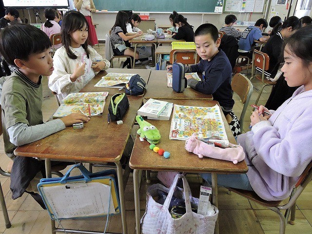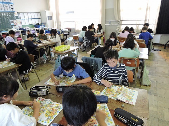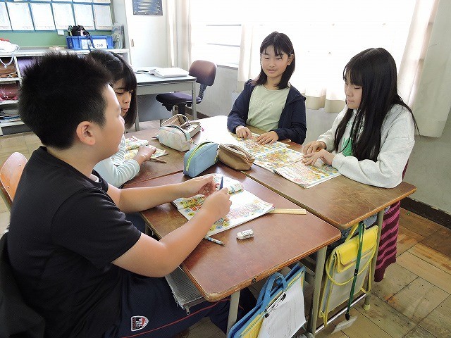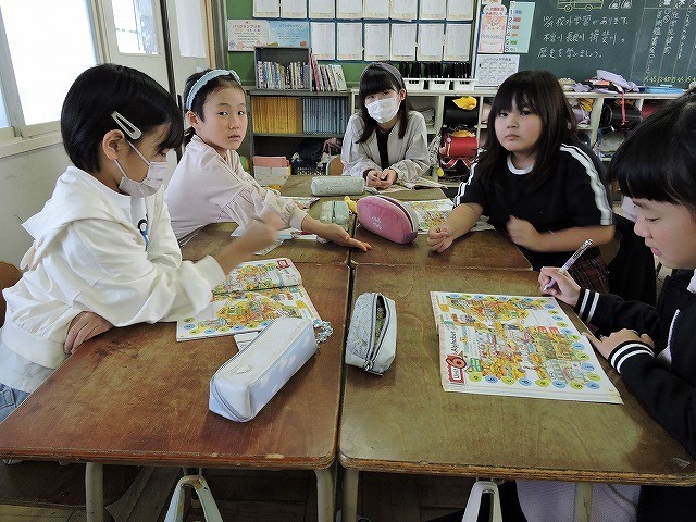 テキストのイラストの中にアルファベットが隠されています。グループで協力してたくさん見つけました。楽しかったです。