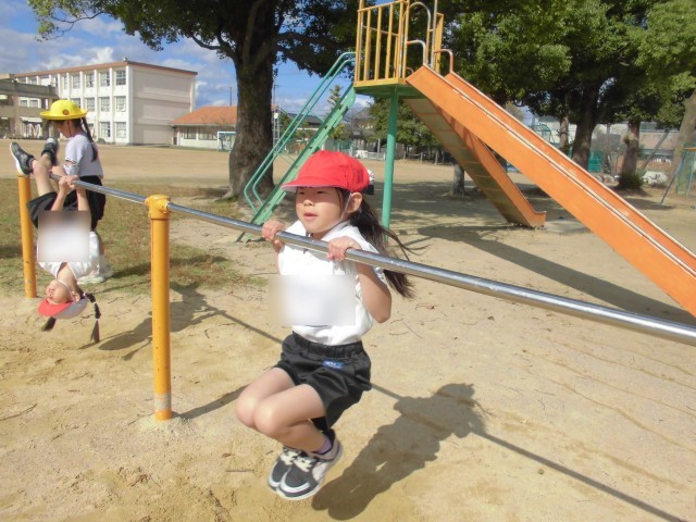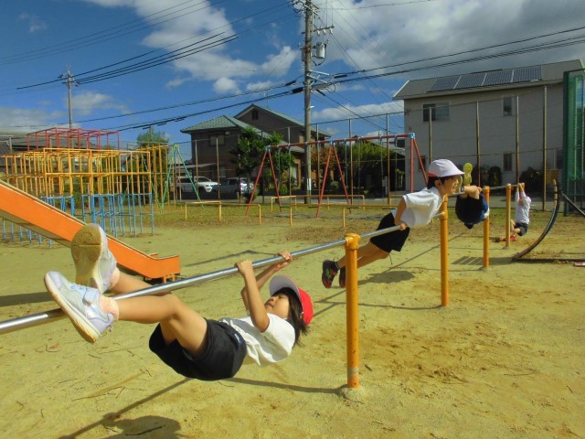 今日は、腕をぴんと伸ばした「つばめ」、足を振って遠くに着地する「とびおり」、体をきゅっと縮める「だんごむし」などいろいろな技に挑戦しました。初めての技でも、やる気いっぱいで何度も練習しています。できるようになると大喜び!友達が成功すると大きな拍手をしてくれる子もいて、みんなでがんばっています。