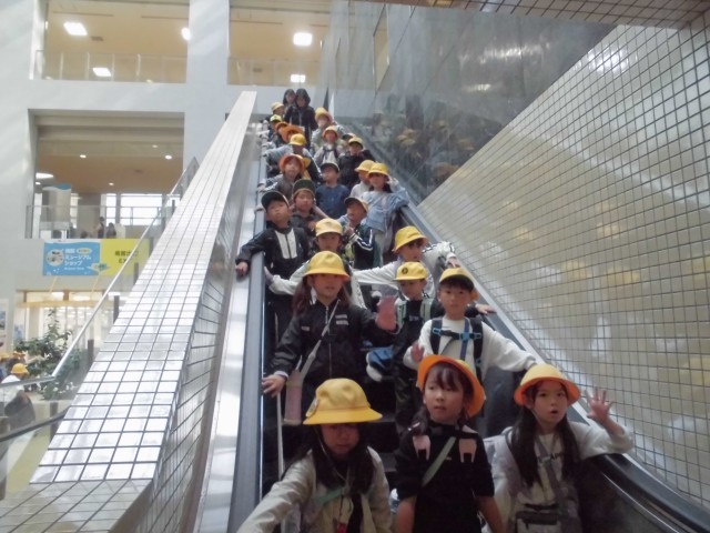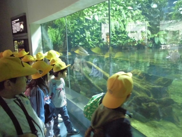 大きな水槽を悠々と泳ぐ魚たちや、真っ暗な部屋の中でふわふわ泳ぐくらげなどを、目をきらきらして見ていました。2年生と1年生で手をつないで仲良く見学することができました。