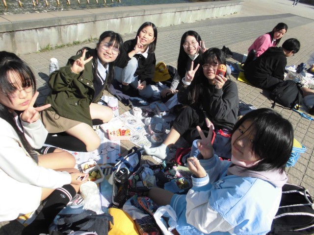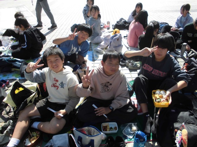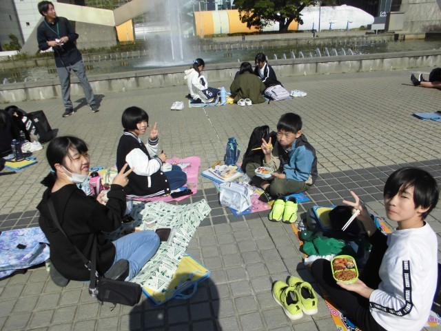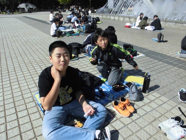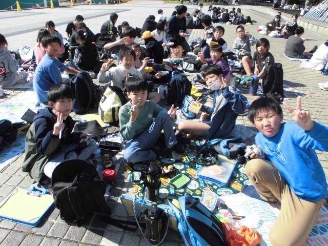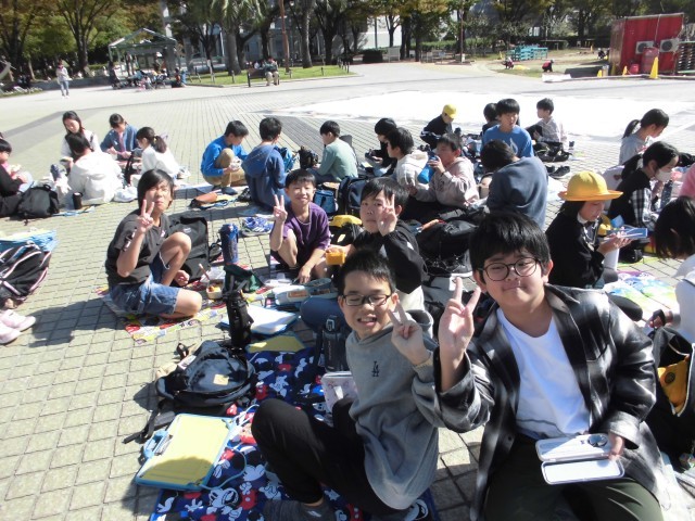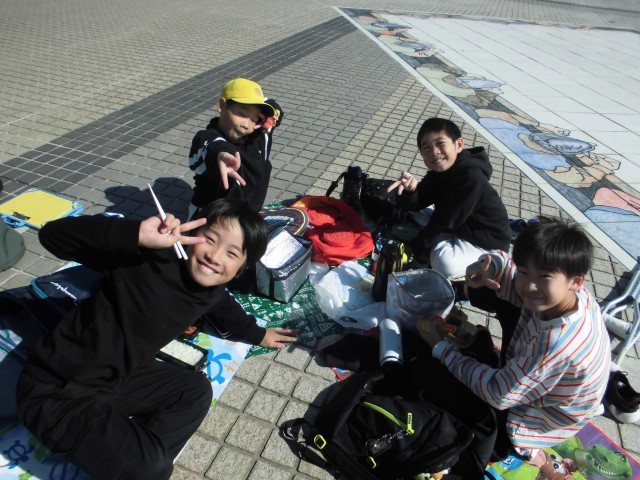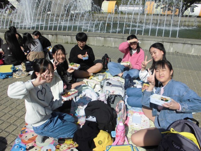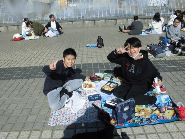 公園で昼食をとりました。朝早くからお弁当の準備ありがとうございました。みんな笑顔いっぱいで、友達と楽しく過ごしている様子でした。