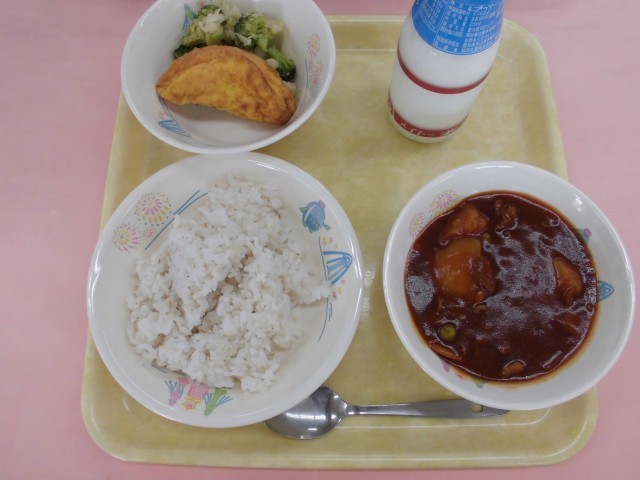 麦ごはん・牛乳・ハヤシライス・オムレツ・花野菜サラダ