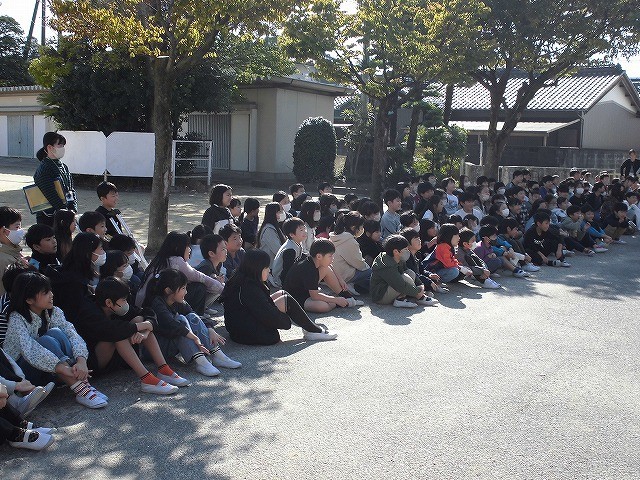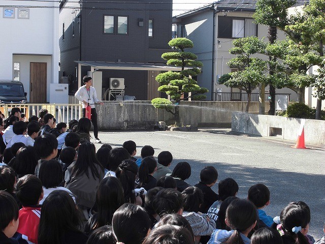 消火器の使い方について学びました。消火するまでの手順を先生から教わりました。みんな真剣に見て学びました。