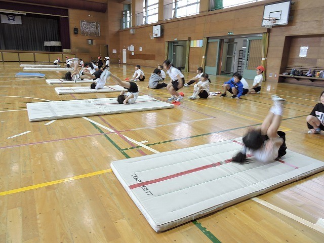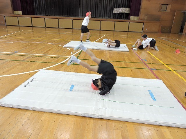 マット運動です。今日は後転を頑張りました。美しく回れると気持ちがよいです。回った後の決めポーズまでしっかりできました。