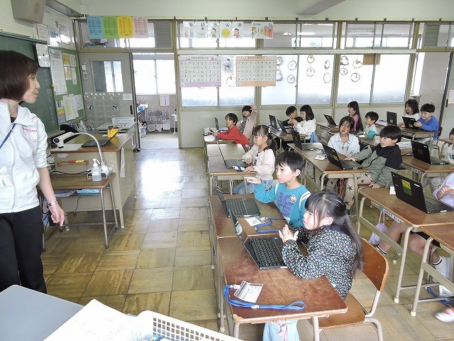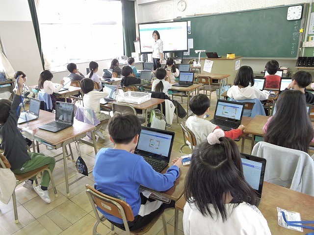 Google classroomから資料を開いて作成します。電子黒板で作業を確認しながら進めていきます。みんなしっかりできていましたね。