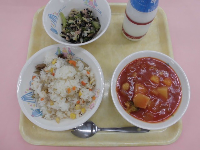鶏ごぼうピラフ・牛乳・ひじきサラダ・ニョッキのトマト煮