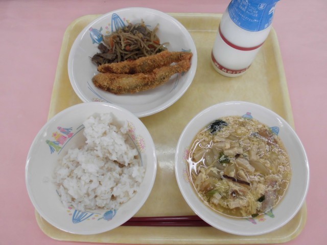 麦ごはん・牛乳・子持ちししゃもフライ2尾・きんぴらごぼう・かきたま汁