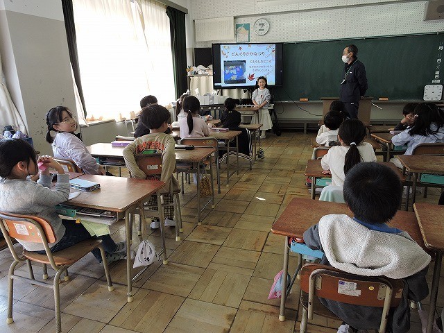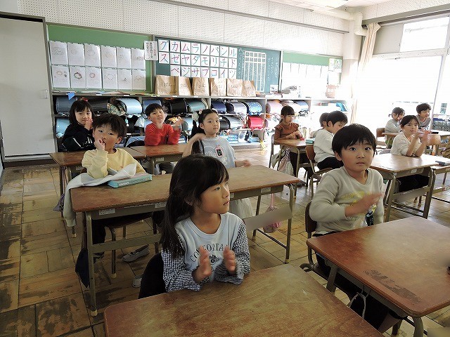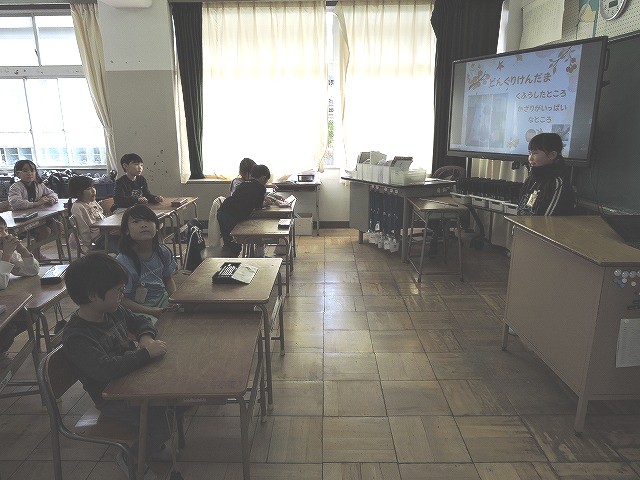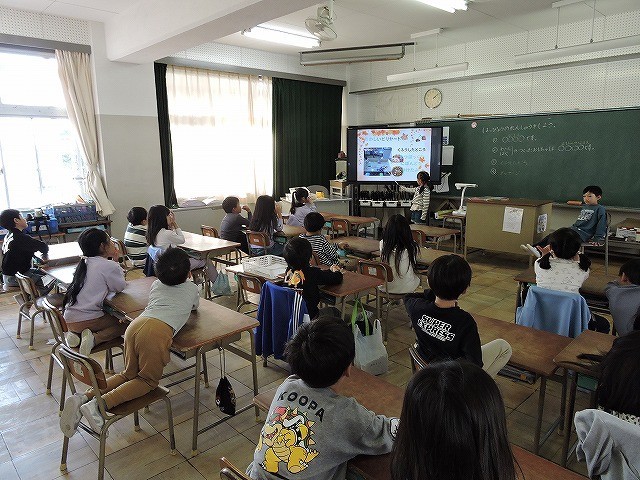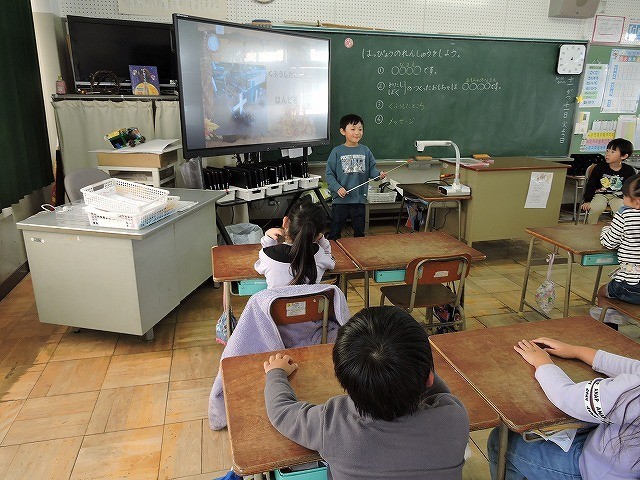 秋見つけの葉っぱや木の実をつかった作品の紹介をしています。発表を頑張りました。みんなが真剣に聞いてくれたのでうれしかったです。