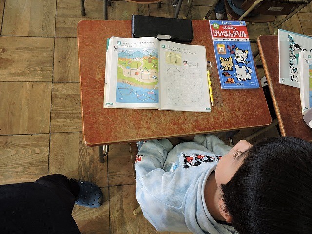 今日は点と点を線でつないで形づくりをしました。点の中心を結ぶように気を付けて、定規で線をひきました。