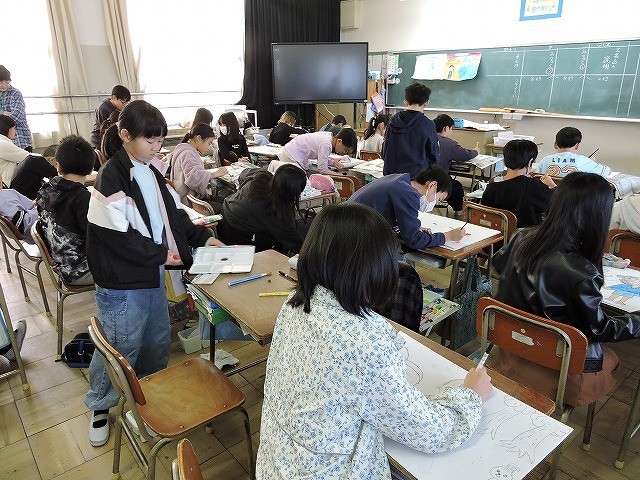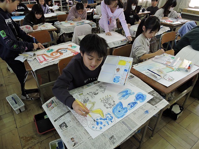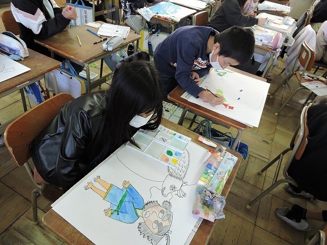 物語の絵を描いています。下絵ができあがり、色塗りをしている人が多くいます。パレットでイメージした色を作りながら下絵に色を付けていきます。よい作品が出来上がりそうです。