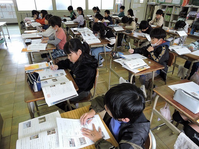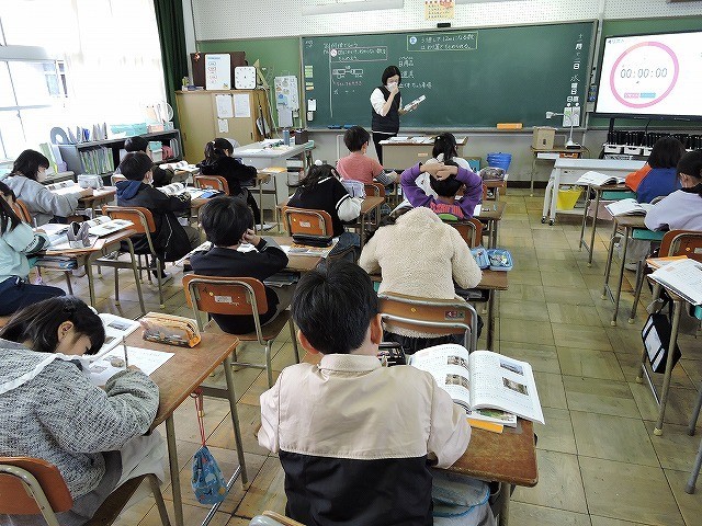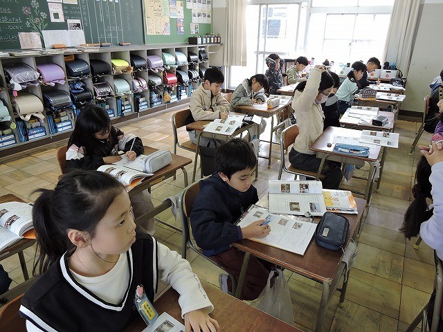 どんな学習でも真剣に望んでいます。黒板の文字をノートに書き写せたら、手を頭にのせるサインで先生に伝えています。