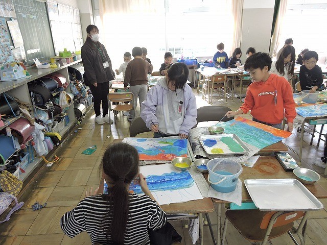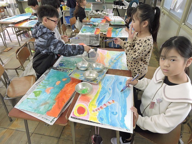 下絵に合わせて色を絵の具でつけています。丁寧に仕上げているのでもうすぐ完成です。