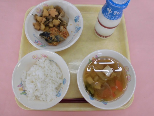 ごはん・牛乳・さばの竜田揚げ・吹寄せ煮・だしを味わうすまし汁