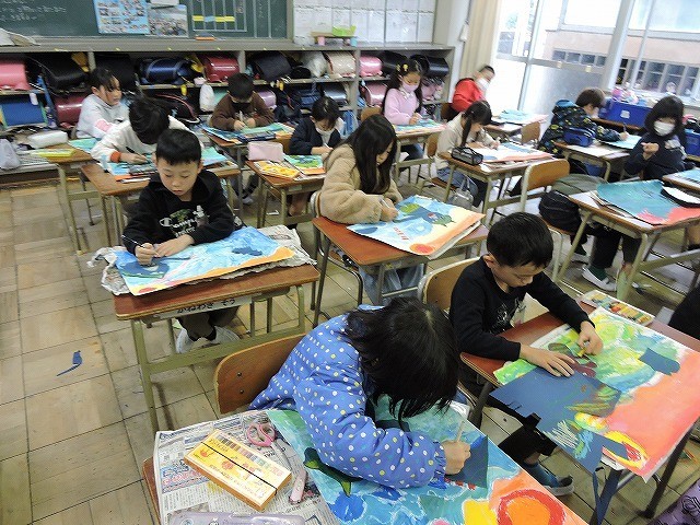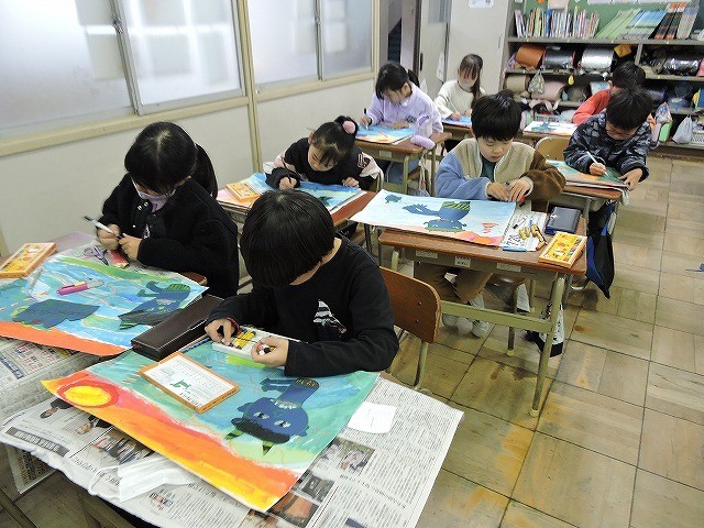 物語の絵を描いています。みんな楽しみながらも真剣に取り組んでいます。完成が近づいてきたので楽しみです。