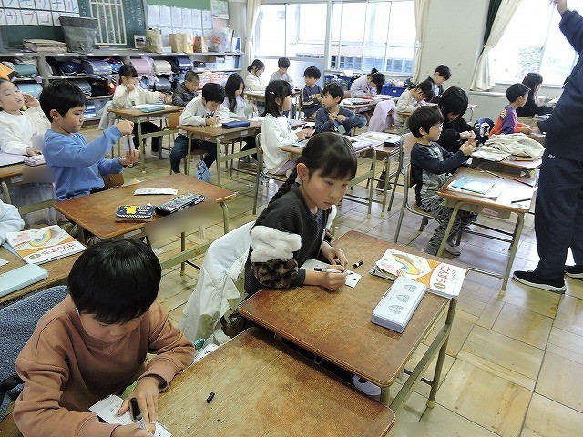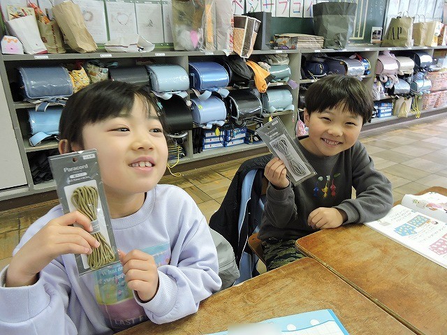 昔遊びで「あやとり」に挑戦します。まずは、あやとりのひもを先生から受け取りました。袋の裏にすぐ名前を書きました。これからのあやとりの活動が楽しみです。