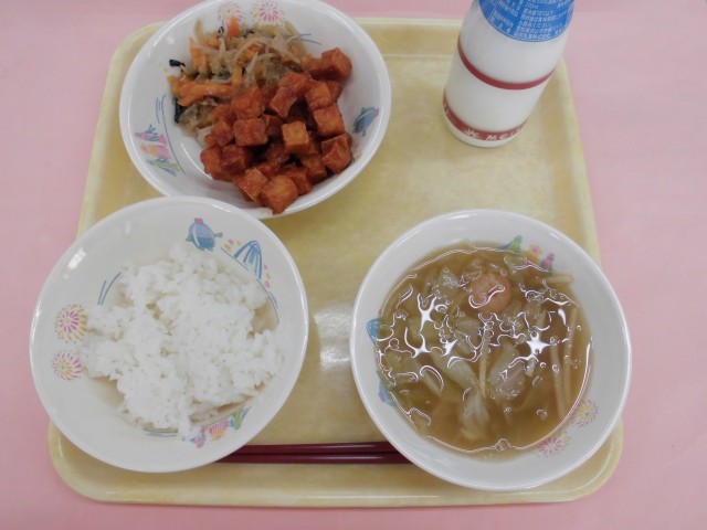ごはん・牛乳・生揚げのヤンニョム・チャプチェ・えび入りトックスープ