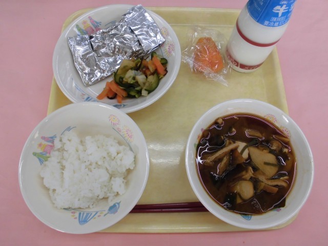 ごはん・牛乳・さけの銀紙巻き・つぼ漬け和え・さといものみそ汁・かき